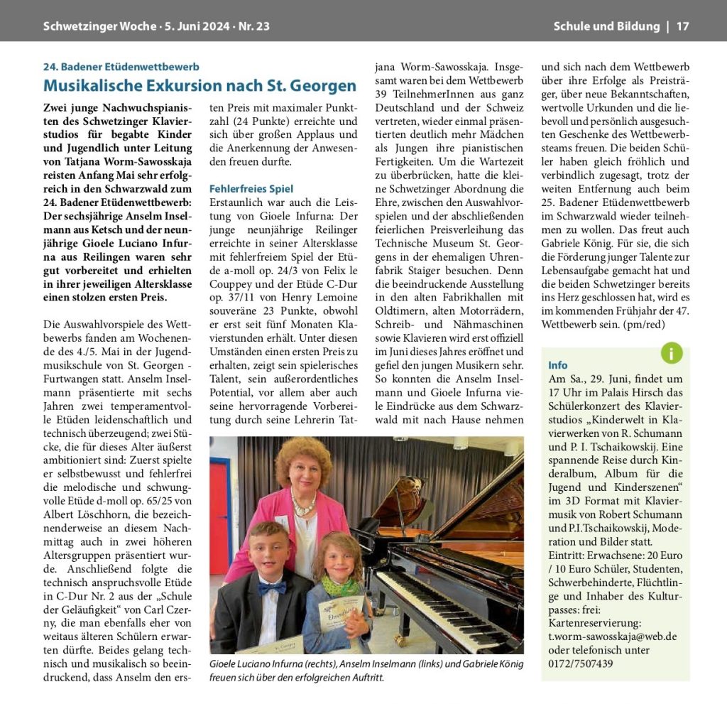 1.Preis beim 24.Klaviertüden-Wettbewerb in St.Georgn, Schwarzwald. Gioele Luciano Infurna, 9 J., und Johannes Anselm Inselmann, 6 J. Previous Story