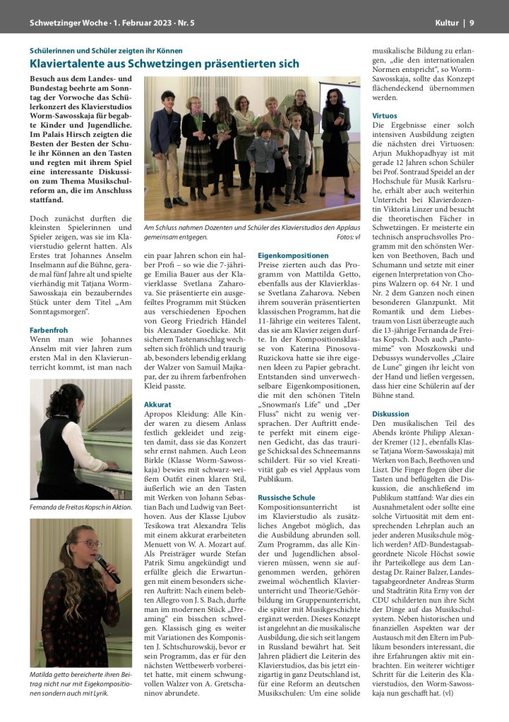 K Klaviertalente aus Schwetzingen präsentieren sich Schwetzinger Woche 01.02.2023 26.01.2023 1 Min Read 0 31 Kategorie : Presse Tagged in: presse Share Article: